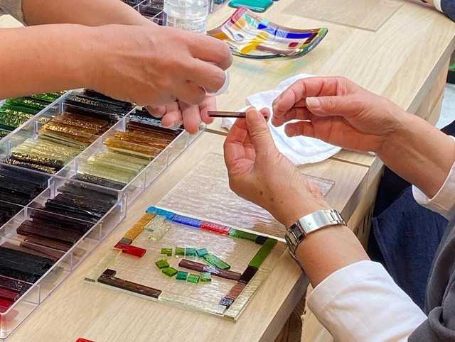 宮城県仙台市秋保町のガラス工房 尚では、ガラス作品の制作体験ワークショップを行っております。様々な色のガラスのピースを使用し、好きな模様のオリジナル作品を制作することが可能です。